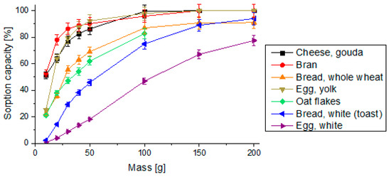 Food product sorption capacity, relative standard deviation values below 5%. The given values are expressed as the mean of five replicates (n = 5). SD is indicated by the error bars.
