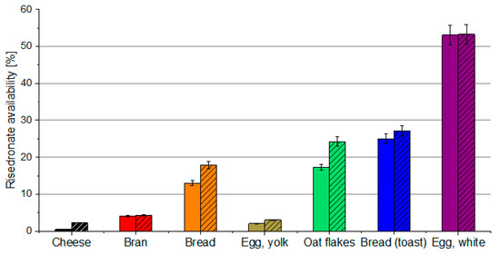 The test results given in Figure 3 indicate that, in the presence of phosphate buffer, the availability of the free fraction of bisphosphonate is increased by about 1% in the presence of bran and egg yolk, while it is increased to approximately about 10% in the presence of oatmeal, whole grain bread, and white bread. Since phosphates are well tolerated and available in a variety of food such as beverages, bread, and meat products, such interaction is favorable from the application point of view. It can be used for the development of formulations containing phosphates as well as for the adjustment of the composition of diet during pharmacotherapy to minimize the loss of the available fraction of the API upon sorption.