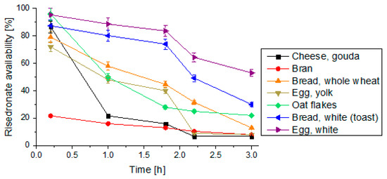 A sorption test simulating the simultaneous intake of 100 mg risedronate and 100 g of food components was conducted at a smaller scale using one gram of each food component and one milligram of risedronate. Graphs illustrating the risedronate availability over time that were obtained for the simulated digestive system during simultaneous intake of risedronate and food products are presented in Figure 4. Digestion was simulated by mixing the selected food components with fluids simulating gastric juice (SGF with pepsin) and subsequently, the small intestinal fluids with pancreatin (SIF). It can be assumed that 100 g of the white part of the egg sorbs less than 50% of the dose. As such, according to these studies, 55 mg of risedronate will still be available and absorbable by the intestine after 3 h of digestion. It can therefore be assumed that the consumption of egg white and white bread will have the lowest impact on the reduction of bioavailability of risedronate (Figure 4).
