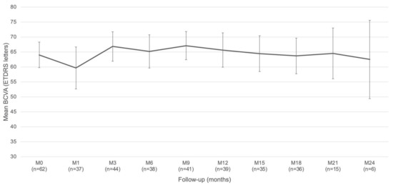 The mean (SD) baseline BCVA was 64.0 (17.2) letters (median: 67.5 letters). The maximum mean (SD) BCVA was 66.8 (16.7) letters, observed at 3 months, and was significantly different from baseline (p = 0.03, Figure 1).