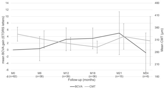 The mean (SD) baseline CMT was 333.3 (112.6) µm, and the mean (SD) CMT at 24 months was 305.7 (121.4) µm. The best overall mean (SD) CMT improvement occurred at 18 months and was significantly different from baseline at 280.5 µm (74.4) (p < 0.0001, Figure 2). A total of 23 eyes (37.1%) were considered as anatomical responders. For patients with an initial CMT < 300 µm (mean (SD) CMT: 246.6 (35.3) µm at baseline) the mean CMT consistently remained below the 300 µm threshold throughout follow-up, with a significant minimum mean (SD) CMT of 239.0 (59.3) µm at 18 months in comparison to the baseline value (p < 0.001). Eyes with an initial CMT ≥ 300 µm (mean (SD) CMT: 400.1 (105.8) µm at baseline) showed a significant minimum mean (SD) CMT of 310.1 (70.8) µm at 18 months in comparison to the baseline value (p = 0.04).