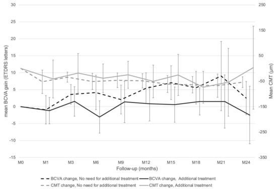 Best corrected visual acuity (BCVA) and central macular thickness (CMT) evolutions depending on need for additional treatment or not.