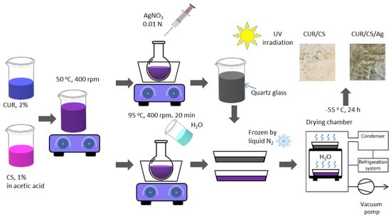 Curdlan/chitosan/Ag membranes were prepared by the reduction of AgNO3 (Alfa Aesar, A Johnson Matthey Company, Tewksbury, MA, USA) under ultraviolet (UV) irradiation. Then, 0.01 N AgNO3 (≈0.5 wt.% Ag in terms of the dry residue of the mixture) was added dropwise to the curdlan/chitosan solution during the polymerization reaction (20 min; 90 °C; V = 60 mL/h), after which the solution was irradiated with a UV lamp (wavelength λ = 185 nm). The same H2O volume was added to the pure curdlan/chitosan solution to compensate for the volume difference. Finally, the resultant samples were cooled, frozen at −196 °C, and subjected to a lyophilization process (Martin Christ Alpha 1-2 L.D. plus, Osterode am Harz, Germany) for 24 h to obtain a foam-like structure. A schematic of the curdlan/chitosan and curdlan/chitosan/Ag foam fabrications is shown in Figure 1.