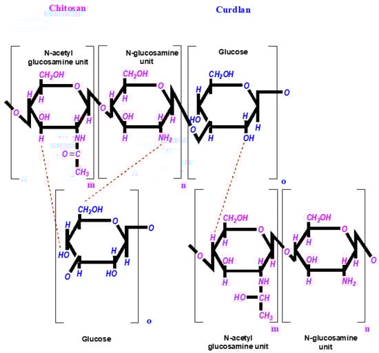 The structure of curdlan and chitosan and the possible chemical interactions between their functional groups (hydroxyls, hydrogen, and amino-groups are involved in the formation of hydrogen bonds) are presented in Figure 2.