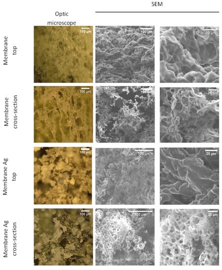 To obtain a foamy microstructure of both biomaterials (CUR/CS and CUR/CS/Ag) with a superabsorbent capacity, a lyophilization method was used. Figure 3 shows images of the fabricated biomaterials obtained using optical and scanning electron microscopy, which clearly show the porous structure of both samples. Interestingly, CUR/CS/Ag has a foamy structure with a higher microporositiy than CUR/CS, which can be explained by the increased viscosity of the initial Ag-contained solution. The foamy structure should provide a good absorption capacity and appropriate oxygenation for wound regeneration. The chemical composition of the obtained materials, determined by the EDXS method, is given in Table 1.