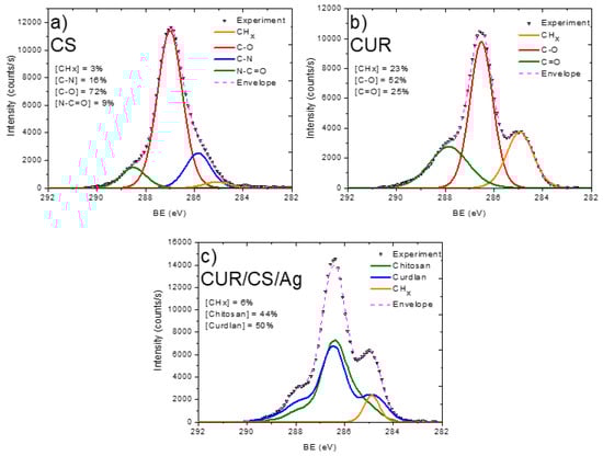 The carbon, oxygen, and nitrogen environments were also highly interesting in the detailed analysis. The CUR/CS/Ag samples impregnated with Ag nanoparticles showed an Ag signal in both the EDXS and XPS spectra. The Ag content was estimated to be ~0.4 at %. The presence of silver in the CUR/CS/Ag sample was evidenced by the presence of the Ag3d XPS peak (Figure 6c) at position 367.8 eV, corresponding to the Ag2O phase. The XPS C1s signal of CUR/CS/Ag was approximated using the CASA XPS software by introducing a new line that replicated the form of the signal from the CS and CUR samples. Finally, the C1s signal was fitted with a sum of three components: CS, CUR, and CHx (BE = 284.9 eV, FWHM = 0.8 eV). The intensity of the CHx component was only 6% and was probably associated with the surface contamination. The CS/CUR ratio, estimated by the curve fitting, was 1:1.14, with a slight predominance of curdlan. A similar ratio was estimated from the elemental composition of the CS/CUR-Ag sample. Indeed, as nitrogen is present only in chitosan, and we know the atomic composition of CS, the CS/CUR ratio can be estimated using Equation (1), where [C]CS, [N]CS, [C]CUR/CS/Ag, and [N]CUR/CS/Ag are carbon and nitrogen concentrations in the CS and CUR/CS/Ag samples, respectively.