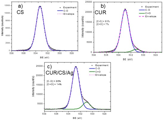 XPS O1s curve fitting of CS (a), CUR (b), and CS-CUR-Ag (c) samples.