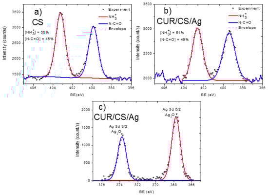 XPS curve fitting of N1s signal of CS (a) and CS-CUR-Ag (b) samples, and Ag 3D spectrum of CS-CUR-Ag (c).