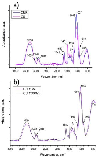 FTIR spectra of curdlan-chitosan (a), and CUR/CS and CUR/CS/Ag (b) biomaterials.