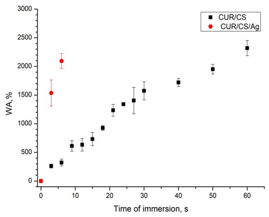 The wetting time of the superabsorbent foam dressings was measured, and the obtained results are shown in Figure 8. Shorter wetting times indicate better wetting. As can be seen, the addition of Ag NPs significantly affects the absorption rate. CUR/CS/Ag foams had a much faster wetting rate than the foam dressings without Ag NPs (6 s for CUR/CS/Ag versus 60 s for CUR/CS). However, the amount of absorbed liquid was almost the same.