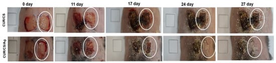 The representative photographs showing the healing dynamic of full-thickness skin with (right wound) or without (left wound) treatment with curdlan/chitosan and curdlan/chitosan/Ag foams, for each of the groups of animals, n = 3. The ovals show the foams of the treated wounds. Wounds were covered with biomaterials for 10 days, after which healing occurred without the influence of biomaterials.