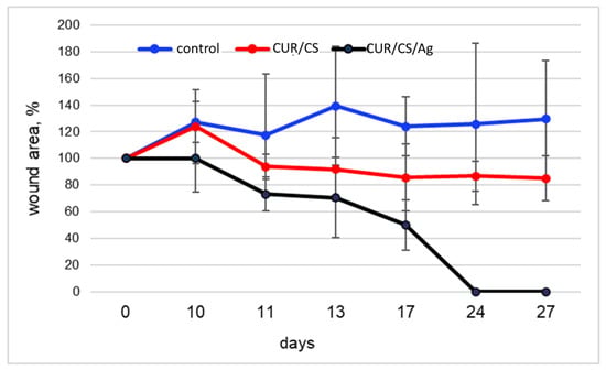 The influence of membranes (red—CUR/CS; black—CUR/CS/Ag; blue—untreated control) on the dynamics of the wound defect closure. The graph shows the dynamics of the closure of a full-thickness skin defect in mice with genetically determined type 2 diabetes mellitus. Each animal (n = 3 in each group in total) received a control wound (without therapy) and an experimental wound (treatment with test materials). The percentage of closure was calculated based on the initial size of the wounds in order to assess the actual dynamics of healing. The graph shows the increase in the sparing of the control wounds for all observation times, as well as wounds with CUR/CS therapy on day 10 (removal of the dressing).