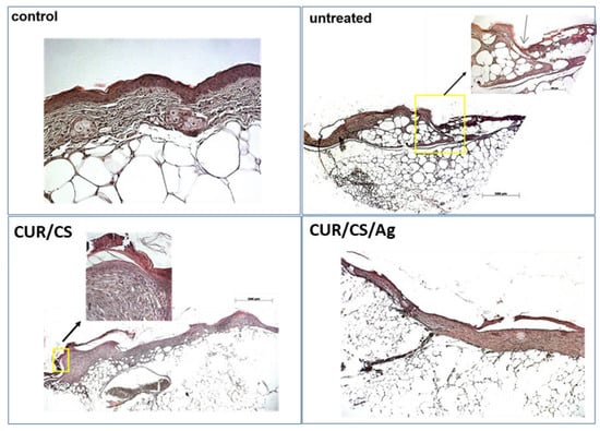 The histology analysis (Figure 11) of the wound after 24 days revealed an accumulation of inflammatory cells (polymorphonuclear and mononuclear) in the untreated controls (Figure 11). The wounds are covered with scabs, filled with a mixture of non-cellular debris and dead leukocytes, and re-epithelialization is low. Along the edges of the wound, neuroepithelial growths are clearly visible, the border between the wound and areas of healthy skin are noticeable. Moderate re-epithelialization is observed in the wound treated with CUR/CS, covering a partially organized layer of medium-thick granulation tissue with signs of pericellular edema and, accordingly, sparse cell density. Capillary neovascularization is noted. There are remnants of a scab of non-cellular remnants of red blood cells and exudate. In the CUR/CS/Ag treated specimen, the wound defect is no longer present. There is a layer of granulation tissue formed during the remodeling process. Vessels that are newly formed capillaries, as well as vessels of larger diameter, are also observed. There are no signs of edema and active inflammatory reaction. Re-epithelialization is almost complete, but in places, detachment of the epithelium is noted. The remains of a scab and crusts were not found. Thus, the observed histological picture confirms the almost complete healing of the wound during CUR/CS/Ag therapy.