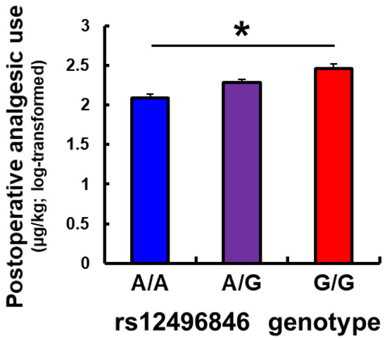 Association analysis between postoperative opioid analgesic requirements and the C3orf20 rs12496846 SNP in subjects who underwent major open abdominal surgery, showing the total dose of analgesics that were administered per body weight (μg/kg; log-transformed) during the 24 h postoperative period. * Corrected p < 0.05, greater dose of analgesic administered as the number of the G allele of the rs12496846 SNP that was carried in subjects increased. The data are expressed as mean ± SEM.