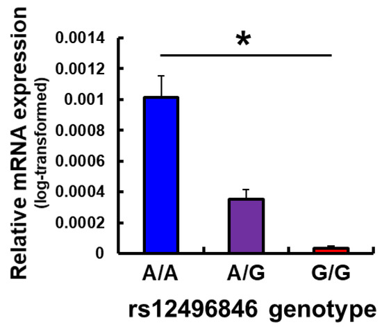 Relative mRNA expression level of the C3orf20 gene between each genotype subgroup of the rs12496846 SNP in postmortem brains. * p < 0.05, lower level of mRNA expression as the number of the G allele of the rs12496846 SNP that was carried in subjects increased. The data are expressed as mean ± SEM.
