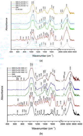 ATR-FTIR spectra of the systems of the S. baicalensis radix lyophilized extract with chitosan 80:500 and chitosan 80:1000 are presented in Figure 1a,b, respectively. In terms of chitosan, the 80:500 and the 80:1000 are the most characteristic, whereas IR absorbance peaks are in the range from 897–1650 cm−1 and 2800–3450 cm−1. The bands corresponding to the stretching vibration of Cs 80:500/Cs 80:1000 are located at 1026/1026 cm−1, 1061/1061 cm−1 (C–O), 1150/1150 cm−1 (C–O–C, asymmetric), 1314/1338 cm−1 (C–N, of amide III), 1587/1572 cm−1 (amide II peak), 1652/1657 cm−1 (C=O, of amide I), 2870/2874 cm−1 (C–H, symmetric) -/2922 cm−1 (C–H, asymmetric), 3293/3296 cm−1 (O–H), and 3358/3364 cm−1 (N–H). Next, the bands corresponding to the bending vibration are located at 893/893 cm−1 (C–H, out of plane), 1259/1250 cm−1 (hydroxyls), 1420/- cm−1 (CH2), and 1587/1572 cm−1 (N–H, of the primary amide) [76].