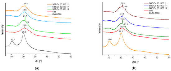 The powder XRPD patterns of the extract, chitosan, and the binary systems are presented in Figure 2a,b. The S. baicalensis radix lyophilized extract diffractogram demonstrates one broadened peak around 21° 2θ, whereas XRPD patterns of Cs 80:500 and Cs 80:100 show two peaks around 11° and 20° 2θ. In all diffractogram patterns of the binary systems, the peak shape characteristic of the extract is retained; however, it is worth noting that additional peaks are also present at around 21° 2θ (in all the binary systems) and 24° 2θ (in SBE/Cs 80:500 1:2, SBE/Cs 80:1000 2:1 and 1:2). In fact, they are likely to be nanocrystalline peaks derived from chitosan. Thamilarasan et al. characterized chitosan nanoparticles using XRPD, and observed peaks at around 23 and 26° 2θ [80]. Nevertheless, the method used to prepare the binary system could have influenced the formation of chitosan nanocrystals. According to Zhao et al., lyophilization was indicated as a common technique in the fabrication of chitosan nanoparticles [81]. Additionally, with increasing amounts of chitosan in the binary systems, the increased intensity of these crystalline peaks was also observed.