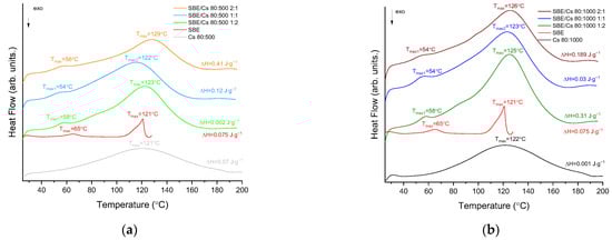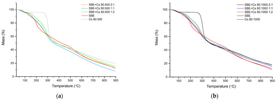 In Figure 3b, the first step observed up to approximately 74 °C, 71 °C, 70 °C (SBE/Cs 80:1000 2:1, 1:1, 1:2 respectively), 119 °C (SBE), and 71 °C (Cs 80:1000), corresponding to the water loss (mass lost = 5%). The second step, up to 300 °C, occurs in different speeds for all the binary systems samples. In this range, the thermal decomposition is the slowest for SBE/Cs 80:500 1:2, and the fastest for SBE/Cs 80:500 2:1 (due to the amount of chitosan in the sample). The third step is in the range of 300–900 °C. From around 300 to 403 °C, the process occurs equally as fast for SBE/Cs 80:1000 2:1 and SBE/Cs 80:1000 1:2. The residual mass at 900 °C is 10.8%, 15.5%, 17.2%, 18.3%, and 12.3% (SBE/Cs 80:1000 2:1, SBE/Cs 80:1000 1:1, SBE/Cs 80:1000 1:2, Cs 80:1000, and SBE, respectively).