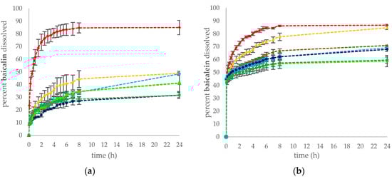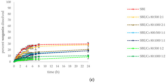 Studies have demonstrated the potential of mucoadhesive properties of chitosan in the design of a local application drug delivery system, which prolongs the drug residence time on the surface of the vaginal mucosa [85,86]. The comparative release profiles of flavones in the binary systems for 24 h in the vaginal fluid simulant solution are shown in Figure 5. The release profiles obtained from flavonoids of pure S. baicalensis radix lyophilized extract were used as a reference. The dissolution profiles of all formulations indicated that the release of the active compounds decreased with an increase of the quantity of chitosan in the binary systems. The binary systems with chitosan amounts in the weight ratio SBE:Cs of 1:2 showed the lowest baicalin, baicalein, and wogonin release profiles, which at the 24 h of the study were in the range (%) of 31.61 ± 1.99–41.02 ± 6.56, 58.80 ± 4.39–59.56 ± 2.39, and 8.29 ± 3.30–10.24 ± 1.42, respectively. In terms of the binary system, for SBE/Cs 80:500 in the weight ratio of 2:1, the weakest prolonged release of active compounds was observed, in particular for baicalein and wogonin, which was 84.60 ± 1.36 and 28.41 ± 3.74 at 24 h of the study. Moreover, a poorer dissolution of baicalin from the binary systems may result from chitosan swelling at an acidic medium due to the protonation of amino groups. It was demonstrated that the diffusion of the entrapped large molecular weight molecules in the chitosan gels is released mainly due to polymer erosion [87]. Additionally, it is suspected that the initial rapid release of active compounds may stem from the dissolution of flavonoids from the surface of the carrier [88].