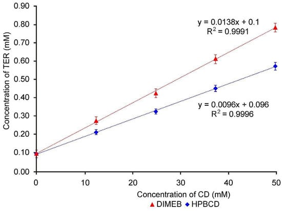 Phase solubility diagrams of TER in aqueous solutions containing DIMEB and HPBCD at 25 °C.