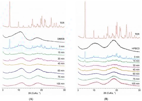 In both cases, 1 g of total product was prepared, which means that 0.1944 g of TER and 0.8056 g of DIMEB were measured. With the same calculation, the HPBCD product contained 0.1713 g of TER and 0.8287 g of HPBCD. Suitable quantities of samples (approximately 50 mg) were removed immediately after homogenization as a physical mixture (0 min) and at prescribed intervals (15, 30, 45, 60, 75, and 105 min) for further physicochemical evaluation.