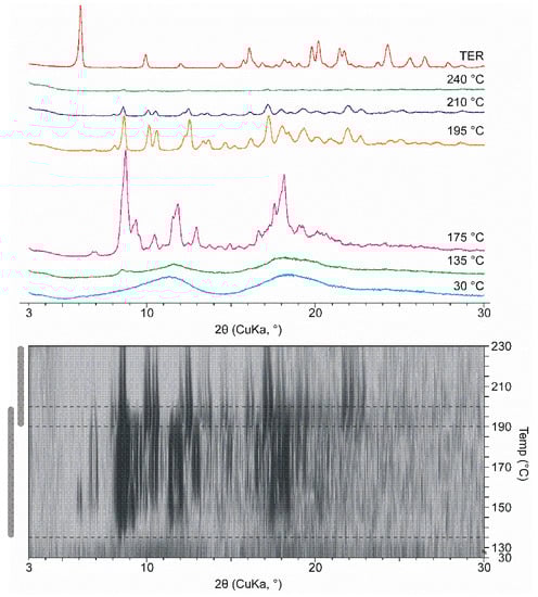 At room temperature, the ground products appeared amorphous. However, due to heat transfer a multi-step crystallization process takes place in DIMEB containing products starting at 135 °C. The most intense peaks in the first part are at 175 °C. The peaks in the second stage are different from the peaks detected at 175 °C, which shows the appearance of a second new crystalline phase. Further heating melted the product completely at about 240 °C. Figure 4 shows the selected curves, the same process can be seen under the curves in 2D visualization. The characteristic peaks that appeared were not identical to those of TER. Furthermore, there is no evidence in the literature that TER exhibits polymorphism. This information allows us to conclude that in this wide temperature range a new crystalline phase forms. This change and temperature range are comparable with the exothermic peak between 135 °C and 190 °C. The differences in temperature ranges are due to the fact that the measurement lasted longer at a given temperature during HOT, thus more heat was transferred to the sample.