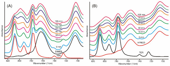The infrared spectra of the samples obtained after different grinding times showed well-recognizable alterations. The broad ammonium N-H stretching band smoothed into the baseline after 30 min, and most of the characteristic bands of TER also disappeared, broadened, and melted into the broad bands of the product, either in the case of DIMEB or HPBCD. The only region where the advance of the formation of the product was possible to follow for a longer period of time was the region of the out-of-plane vibrations of the aromatic rings (Figure 6) [32].