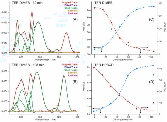 Peak fitting of FTIR spectra in the range of the out-of-plane deformation region resulted in a sigmoid type of curves with the grinding time, which confirmed the expected autocatalytic phase transformation type of kinetics of the product formation. (A)—fitted curves after 30 min grinding with residues of the starting materials in the TER-DIMEB mixture, (B)—fitted curves after 105 min grinding without residues of the starting materials in the TER-DIMEB mixture. Kinetic curves for the starting materials and the products constructed from the areas of the fitted peaks (C)—in the case of TER-DIMEB, and (D)—in the case of TER-HPBCD mixture. The kinetic curves were calculated from the contribution of the areas of the peaks of increasing and those of decreasing intensities to the sum of the peak areas.