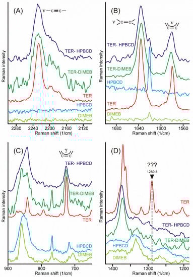 Most of the characteristic peaks in the Raman spectra of crystalline TER overlap with the bands of the products, except the one at 1289.5 cm−1, in the fingerprint region. (A)—region of the stretching band of the carbon–carbon triple bond, (B)—region of the stretching bands of the carbon–carbon double bond and those of the aromatic rings, (C)—region of the out-of-plane deformation bands of the aromatic rings, (D)—region containing the useful peak for the characterization of the presence and the distribution of crystalline TER in the samples.