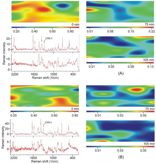 Examples of Raman-intensity maps constructed from the Raman spectra recorded at the grid points, using the intensities at 1289.5 cm−1 of the TER-DIMEB (A) and the TER-HPBCD mixture (B). Top left corner: Mixture of the starting materials. On the right: The maps of the samples taken in the final stage of grinding. Bottom left: Upper spectrum recorded in the high-intensity area of the map of the non-grinded mixture. Lower spectrum recorded at the low-intensity area of the map of the sample ground for 75 min (position marked with a red cross).