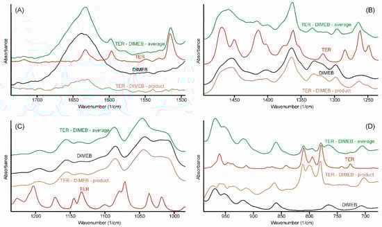 Construction of the FTIR spectrum (regions 1750–1495; 1495–1230; 1430–990; és 990–675 cm−1 (A–D) respectively) of the product in the TER-DIMEB system, by successive subtraction of the spectra of the starting materials from the average spectrum of the samples taken at various times of the grinding process. The spectrum of the product resembled the spectrum of DIMEB. Only the out-of-plane deformation bands of TER can be seen at 809, 798, and 778 cm−1, somewhat shifted. All other bands of TER disappeared, including the tertiary ammonium band (not shown in the Figure).