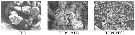 SEM measurements were performed to describe morphology and particle size, these results are shown in Figure 11 and Figure 12. The results of SEM analysis were consistent with those observed with XRPD and DSC. TER crystals appear as clumped in clusters, with a smooth surface without cracks, showing a flat crystalline profile, with an average diameter of 13.44 µm. CD-containing products showed different morphology, the crystal of TER was no longer detectable in either of the two products, where the formation of amorphous aggregates was observed.