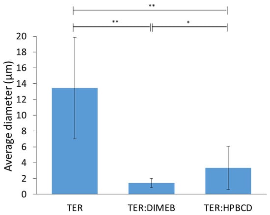 Average diameter and standard deviation of particles (** p < 0.01; * p < 0.05).