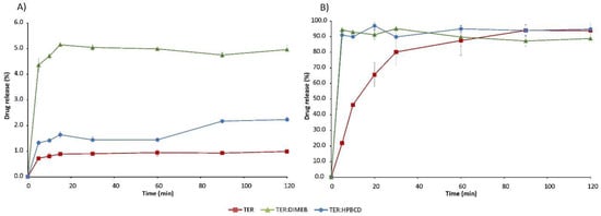 The solubility of the active ingredient is strongly pH-dependent, as it is significantly lower at higher pH. In the simulated intestinal fluid, the solubility of TER is below 1% and the solubility-enhancing effect of CDs is evident with both DIMEB and HPBCD. However, this increase was diverse depending on the excipient used (Figure 13). The DIMEB-containing product increased DE to 4.81% by 120 min, according to the MDT value, the dissolution rate was higher. However, the DE of the HPBCD product rose to a lesser extent to 1.4%, and this was reached with a lower dissolution rate compared to the pure drug (Table 1). During the measurements, the solubility of TER reached almost 100% in simulated gastric medium, but CDs had a positive effect in this case as well, as they increased the dissolution rate of the API. This is shown by the decreased MDT values (Table 1). Data regarding physical mixtures are in Supplementary Table S1.