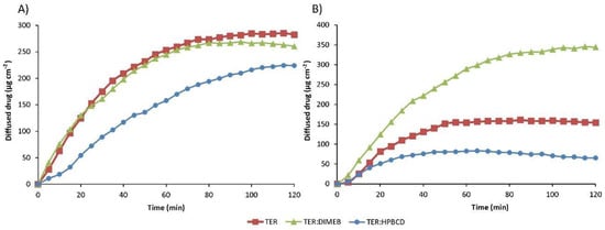 In the simulated intestinal fluid, the Papp of TER was two orders of magnitude smaller than in the lower pH medium. The formulation containing DIMEB showed similar diffusion in the simulated intestinal medium, with the enhancement ratio near 1, and higher diffused drug in the simulated gastric medium, where the enhancement ratio was 2.232.