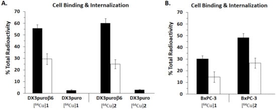 Cell binding studies showed that [64Cu]1 and [64Cu]2 both bound to cells in an αvβ6-dependent manner at similar levels (DX3puroβ6 (+): [64Cu]1 55.8 ± 3.0% of total radioactivity, [64Cu]2 60.2 ± 3.9%; BxPC-3 (+): [64Cu]1 30.3 ± 2.7%, [64Cu]2 48.5 ± 3.5%; and the negative control DX3puro (−): [64Cu]1 2.7 ± 0.5%, [64Cu]2 3.1 ± 0.3%, Figure 2). This resulted in binding ratios for DX3puroβ6 (+) vs. DX3puro (−) of 20.7:1 for [64Cu]1 and 19.4:1 for [64Cu]2. Internalization into αvβ6-positive cells was also high ([64Cu]1: 48.5–52.7% of the bound radioactivity, [64Cu]2: 41.5–54.8%, Figure 2). The non-targeting control ABM conjugates [64Cu]3 and [64Cu]4 exhibited low, non-specific binding to all cell lines (≤4.3%; Figure S24).