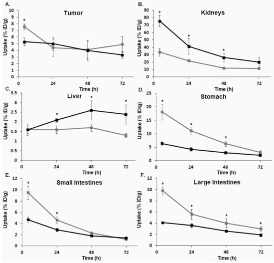 ). (A) BxPC-3 tumors. (B) kidneys. (C) liver. (D) stomach. (E) small intestines. (F) large intestines (* p ≤ 0.05).