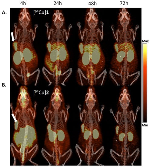 PET/CT imaging. Representative whole-body coronal maximum intensity projections (MIPs) of PET/CT images of mice bearing BxPC-3 xenograft tumors at 4 h, 24 h, 48 h, and 72 h p.i. of (A) [64Cu]1 and (B) [64Cu]2. Arrow: tumor. Decay corrected PET data are shown in color, CT data in gray.