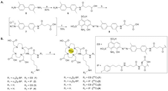 (A) Synthetic route to modified EB-ABM 8. (B) Radiochemical Synthesis of [64Cu]1–4. a. Succinic anhydride, DMF, pyridine (1:1), b. NaNO2, MeOH, HCl/H2O, 0 °C, c. 1-amino-8-napthol-2,4-disulfonic acid, NaHCO3, H2O, 0 °C, d. [64Cu]CuCl2, NH4OAc, 37 °C.