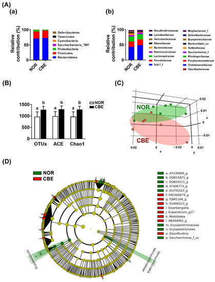 The fresh feces (0.2 g) were collected in a sterilized tube on the 1st day (24 h) after the final treatment with CBE. The genomic DNA was extracted using a QIAamp DNA stool mini kit and amplified using barcoded primers, which targeted the V3 to V4 region of the bacterial 16S rRNA gene, as previously reported [12]. The sequencing was performed using a 454 GS FLX Titanium Sequencing System (Roche, Branford, CT, USA). Sequence reads were identified using the EzTaxon-e database (http://eztaxon-e.ezbiocloud.net/ (accessed on 15 October 2020)) on the basis of 16S rRNA sequence data. The number of sequences analyzed, the observed diversity richness (operational taxonomic units, OTUs), and the estimated OTU richness (ACE and Chao1) were calculated using the Mothur program and defined considering a cut-off value of 97% similarity with the 16S rRNA gene sequences. Sequenced reads were deposited in the NCBI’s short read archive under accession number PRJNA449459.