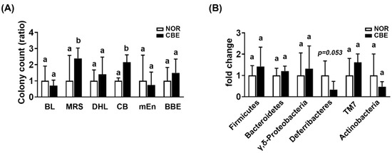 Effect of coffee bean extract (CBE) on the gut microbiota composition in mice treated with vehicle (NOR) or coffee bean extract (CBE). (A) Effect on the fecal microbiota composition, assessed by selective media (BL, MRS, DHL, CB, mEn, and BBE). (B) Effect on the fecal microbiota composition, assessed by qPCR. Data are shown as the mean ± S.D. (n = 6). Means with same letters are not significantly different (p < 0.05).