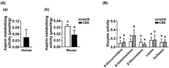 The enzyme activities of human and mouse fecal samples. (A) The fecal aspirin-metabolizing activities. (a) The fecal aspirin-metabolizing activities of humans. (b) The fecal aspirin-metabolizing activities fo mice treated with coffee bean extract (CBE) or vehicle (NOR) (b). (B) The β-glucuronidase, β-galactosidase, β-glucosidase, lipase, and sulfatase activities were analyzed in the feces of mice with CBE or vehicle. Data are shown as the mean ± S.D. (n = 6). Means with same letters are not significantly different (p < 0.05).