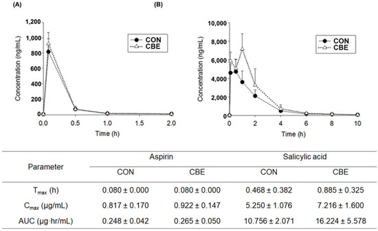 CBE (1.7 g/kg/day) or the vehicle (saline) was administered via gavage once a day for 5 days. Aspirin (5 mg/kg/day) was administered via gavage 24 h after the final treatment with CBE. After oral administration of aspirin, whole blood was collected at 0.03, 0.5, 1, 2, 4, 6, 8, and 10 h by cannulating the carotid artery using a polyethylene tube (PE-50) [12]. The obtained blood samples were centrifuged and the separated plasma samples were carefully maintained at −20 °C until analysis.