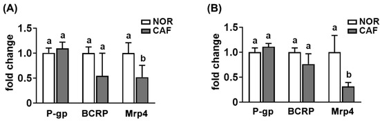 Effect of caffeine (CAF) on the P-gp, BCRP, and Mrp4 expression in the intestines of mice treated with vehicle (NOR) or caffeine (CAF). (A) Effect in the small intestine. (B) Effect in the large intestine. The transporter expression was assessed by qPCR. Data are shown as the mean ± S.D. (n = 6). Means with same letters are not significantly different (p < 0.05).