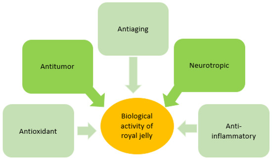 - Maghsoudlou, A.; Sadeghi, A.; Mohebodini, H.; Toldrá, F. Royal Jelly: Chemistry, Storage and Bioactivities. J. Apic. Sci. 2019, 63, 17–40. [Google Scholar] [CrossRef] [Green Version]