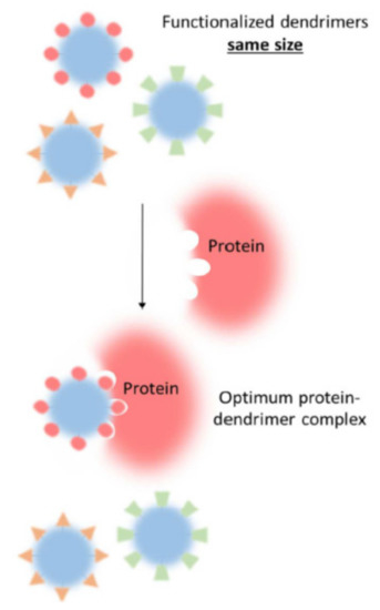 Modification of terminal groups has a great impact on the mechanism of interaction with proteins. A schematic representation of the influence of dendrimer terminal groups on binding is given in Figure 1. If the dendrimer surface preserves the charge after modification, the electrostatic forces are responsible for complexation. Modification with neutral groups alters the driving force of interaction according to the nature of the surface groups. For example, attachment of the neutral maltose residues to PPI dendrimers changes the mechanism of interaction with prion protein from electrostatic to H-bonding [90]. The surface functionalization may either strengthen or weaken the association. The introduction of guanidine groups into the PAMAM dendrimer structure enhanced the binding with the protein due to an increase in the number of charged groups involved in complexation [96].