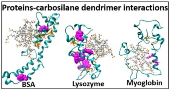 Computer simulations were applied to investigate the interactions of sulfonated carbosilane dendrimers with three different proteins (bovine serum albumin, myoglobin, lysozyme) [88]. The study revealed the effective complex formation between negatively charged dendrimers and BSA possessing net negative charge. As it was mentioned earlier, the electrostatic interactions occurred due to the existence of positively charged regions on the protein surface (Figure 3).