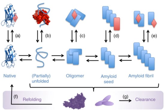Schematic illustration of strategies to inhibit the formation of amyloid fibrils. (a–e) Biochemical mechanisms of action that could be employed by ligands (red) binding to different states of amyloid-forming peptides (blue). (a) Stabilization of the native state. (b) Sequestering of monomeric peptide. (c) Stabilization or promotion of off-pathway oligomers. (d) β-Sheet breakers that terminate fibril elongation. (e) Disassembly of amyloid fibrils. In addition, refolding (f) and clearance (g) mechanisms (purple) can be important in vivo. Reprinted with permission from ref. [119]. Copyright 2012, Elsevier.