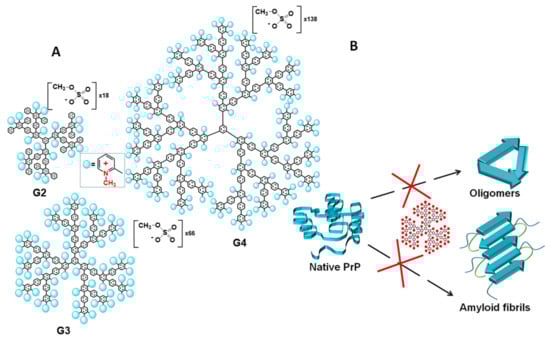- Sorokina, S.A.; Stroylova, Y.Y.; Shifrina, Z.B.; Muronetz, V.I. Disruption of Amyloid Prion Protein Aggregates by Cationic Pyridylphenylene Dendrimers. Macromol. Biosci. 2016, 16, 266–275. [Google Scholar] [CrossRef]