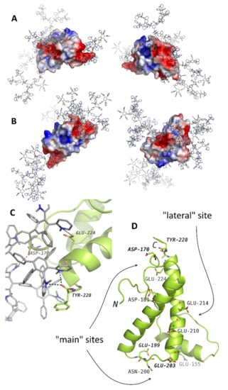 The results of molecular dynamics simulations of prion protein (the structure from the PDB entry 1tqb) with CPPDs of the second (A) and third (B) generations. The typical binding positions are shown. Dendrimers are shown in gray with blue nitrogen; the protein is colored according to electrostatic potential of the surface, where positively charged regions are blue, and negatively charged regions are red. The panel (C) represents an example of interactions in detail. The dendrimer-binding residues are shown in the panel (D). Reprinted with permission from ref. [82]. Copyright 2017, Royal Society of Chemistry.